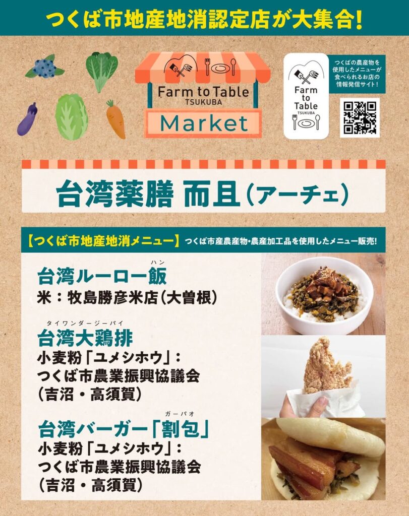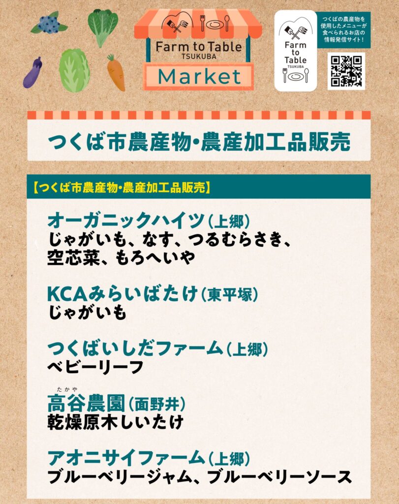 マーケットでは、地産地消店4店舗による「つくば市産農産物を使った特別メニュー」の提供に加え、新鮮な農産物や加工品の販売も実施。
