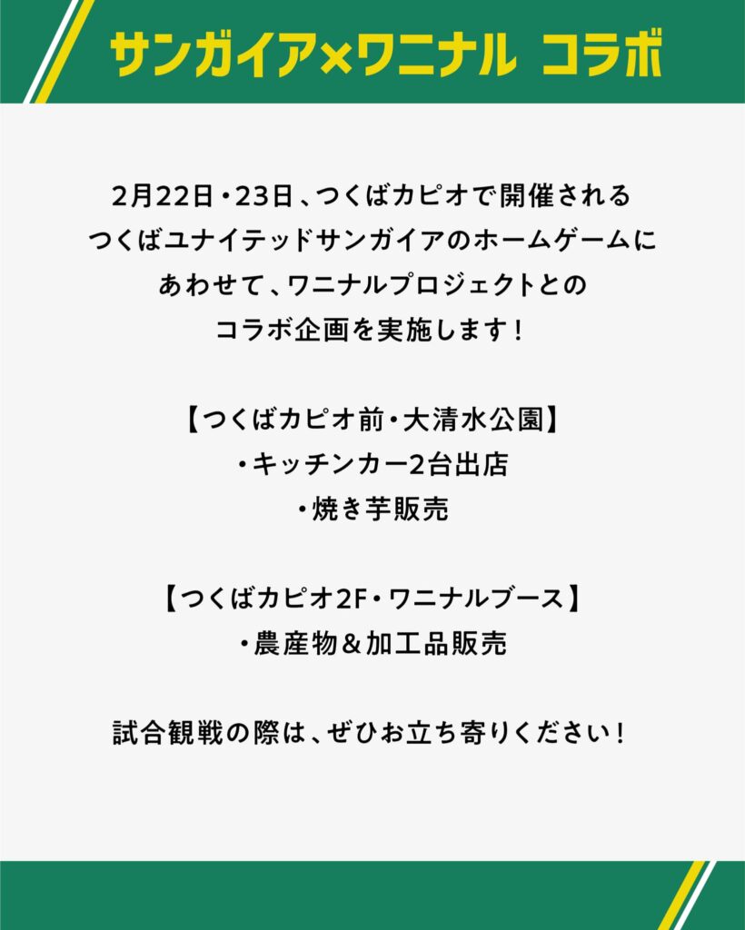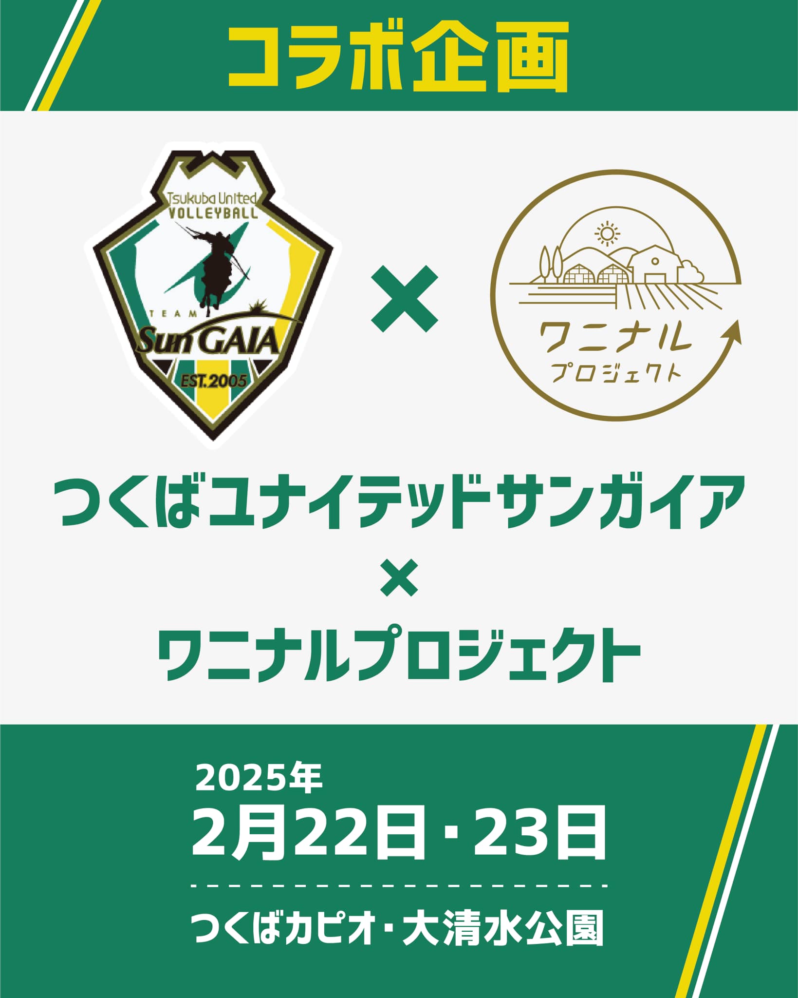 2月22日・23日、つくばカピオで開催されるつくばユナイテッドサンガイヤのホームゲームにあわせて、ワニナルプロジェクトとのコラボ企画を実施します!