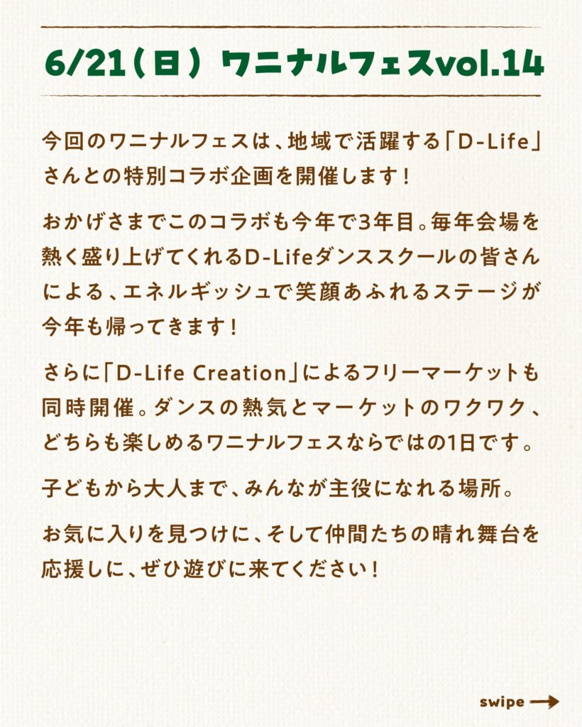 今回のワニナルフェスは、地域で活躍する「D-Life」さんとの特別コラボ企画を開催します!