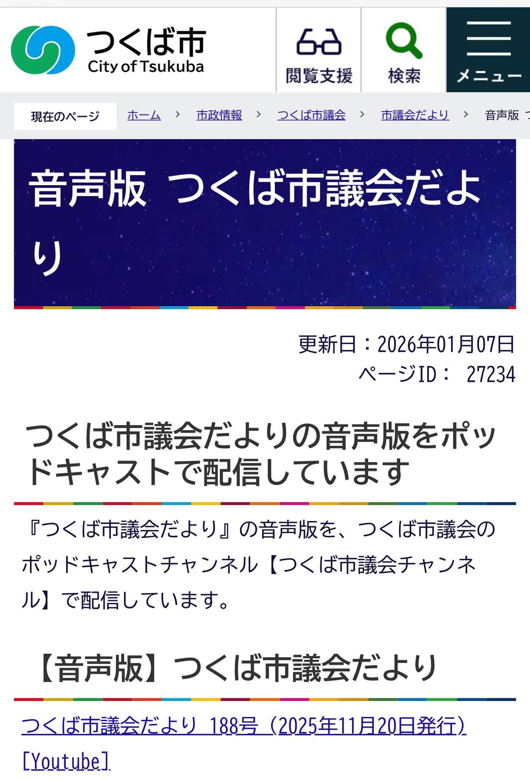市議会だより『音声版』について、つくば市HPに掲載し視聴いただけるようになりました。