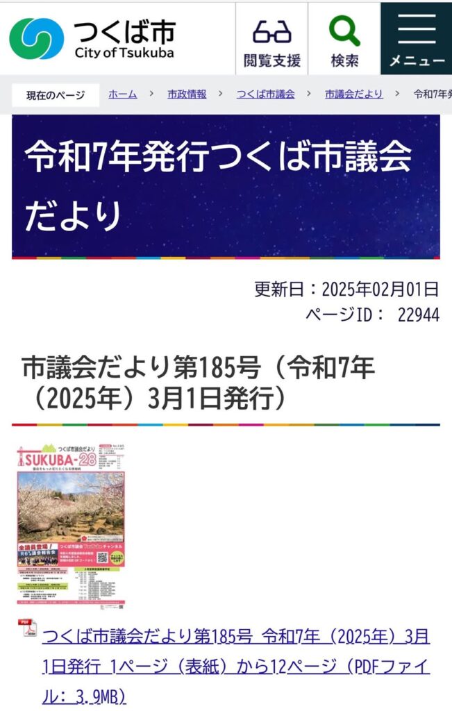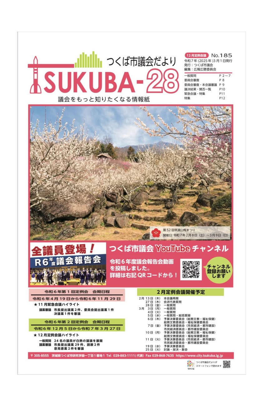 市議会だより第185号(令和7年(2025年)3月1日発行)が市内全世帯に配布されました。つくば市のホームページからもご覧いただけます。