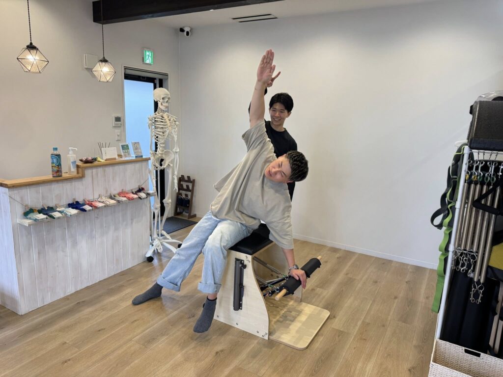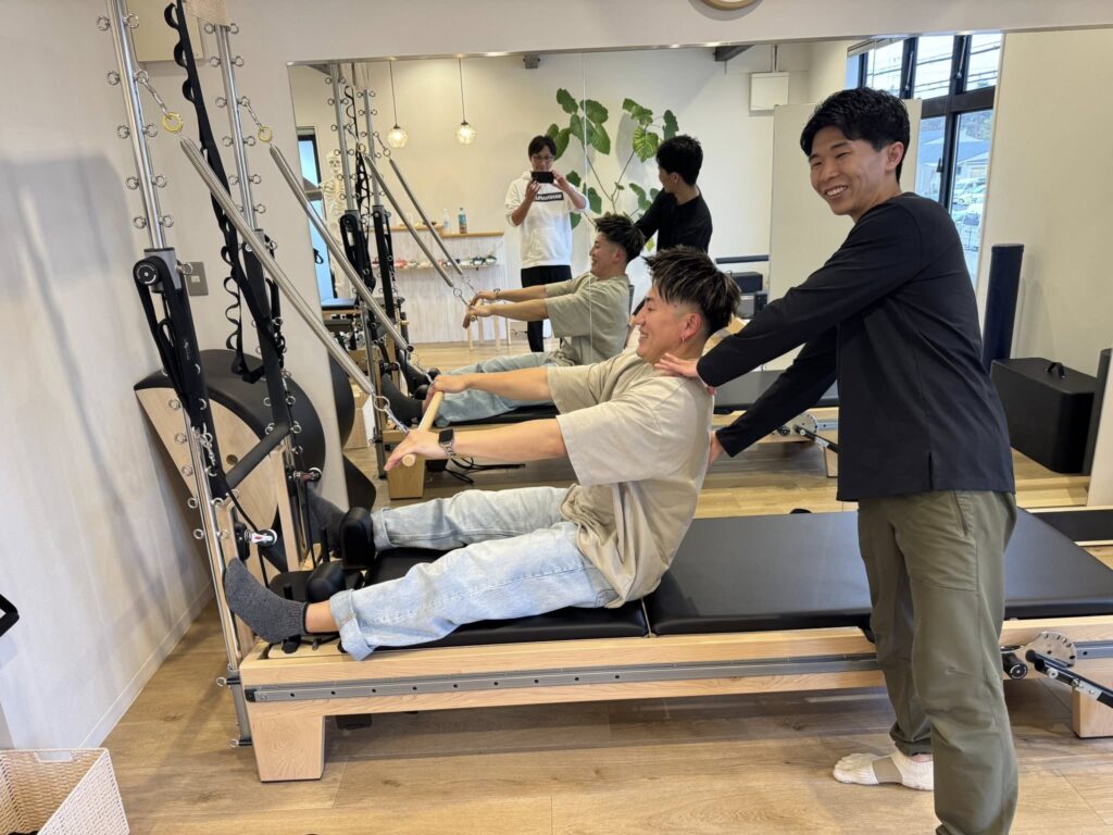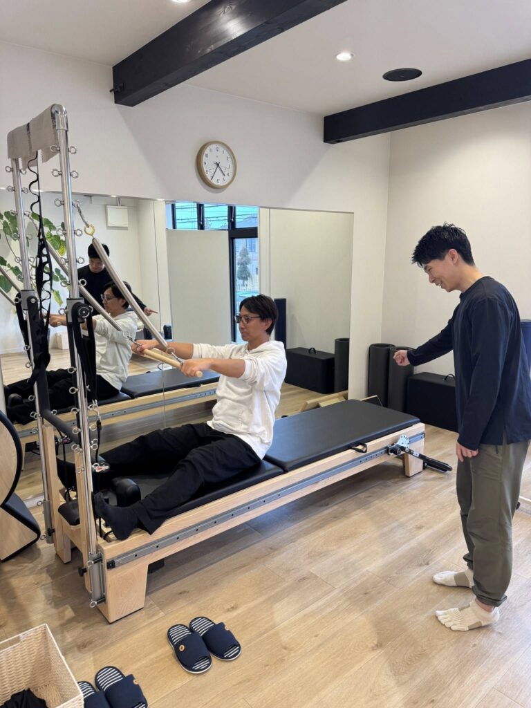 理学療法士の米川さんと意見交換をさせていただき、併せてピラティスの体験もさせていただきました。
