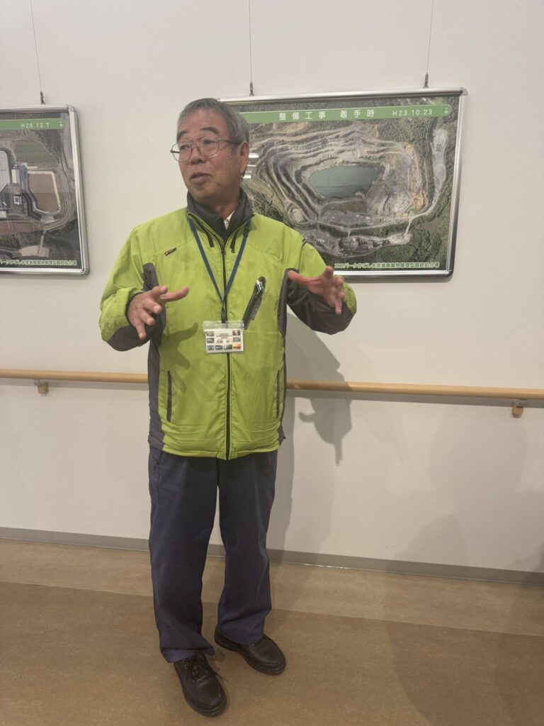 施設内では、遮水構造や浸出水処理工程、厳格な受入基準、継続的な環境モニタリング体制などについて詳細な説明を受け、実際の設備を見学しました。公共関与による運営により、処分の安定性・透明性・安全性が確保されている点は、産業廃棄物行政における一つのモデルケースであると感じました。