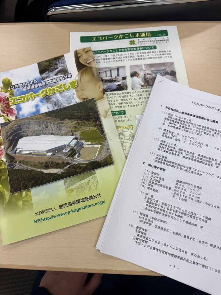 鹿児島県薩摩川内市にある、公共関与による産業廃棄物管理型最終処分場「エコパークかごしま」を行政視察として訪れ、施設見学および運営について学ばせていただきました。