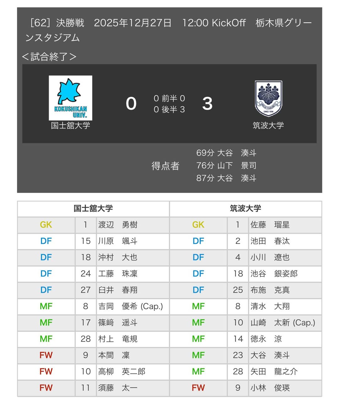 第74回全日本大学サッカー選手権大会(インカレ)の決勝が27日に行われ、筑波大学蹴球部が国士舘大学を3-0で下し、9年ぶり10回目となる優勝を果たしました。