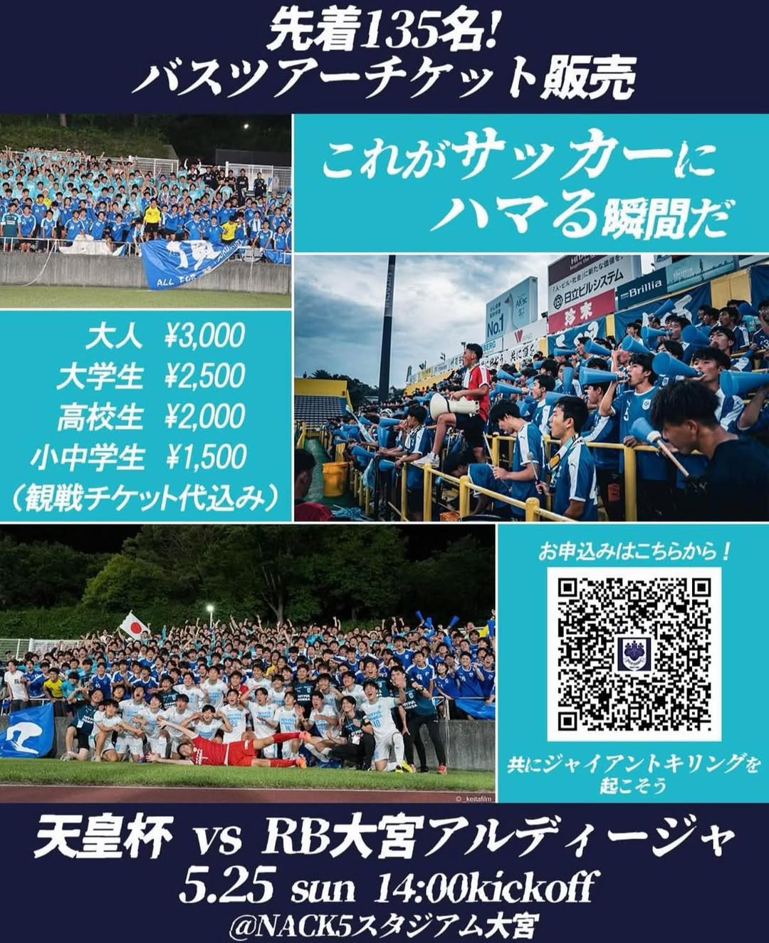 今年の天皇杯初戦の相手はRB大宮アルディージャ!今年も昨年大盛況だったバスツアーを開催いたします!