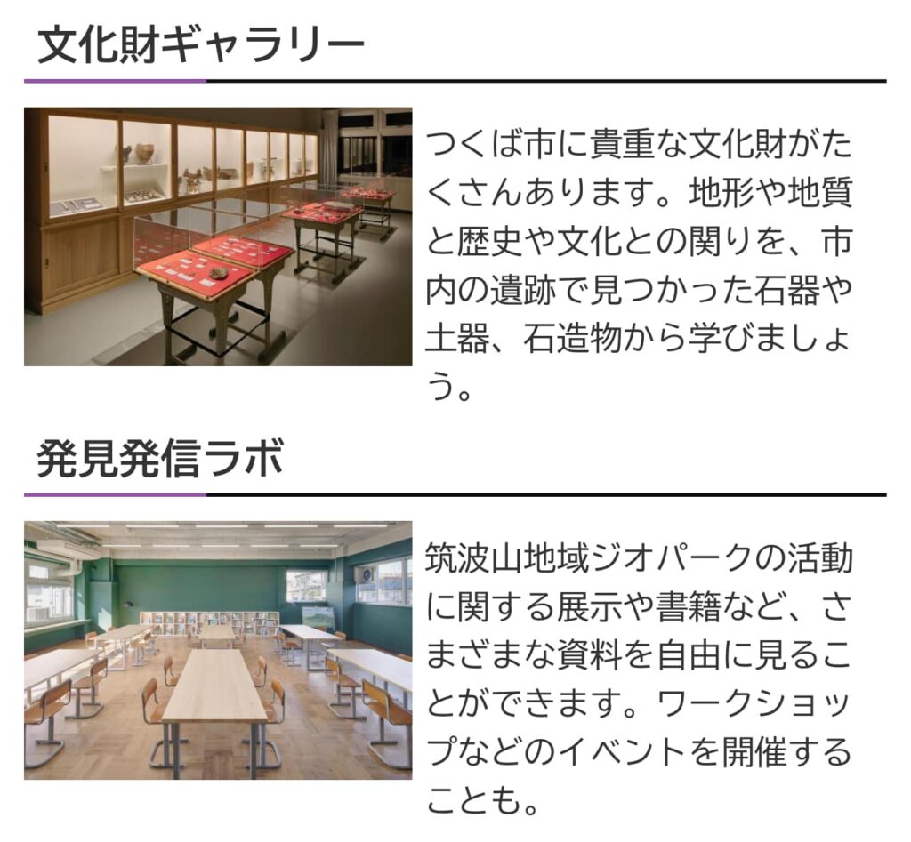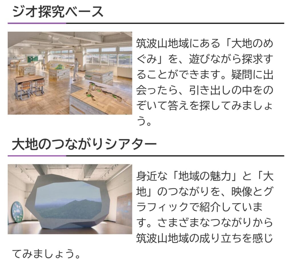 筑波山地域ジオパークの中核となる拠点施設です。1階展示スペースは、教育や観光振興を目的とした自然や文化を次世代に伝える体験型展示施設です。