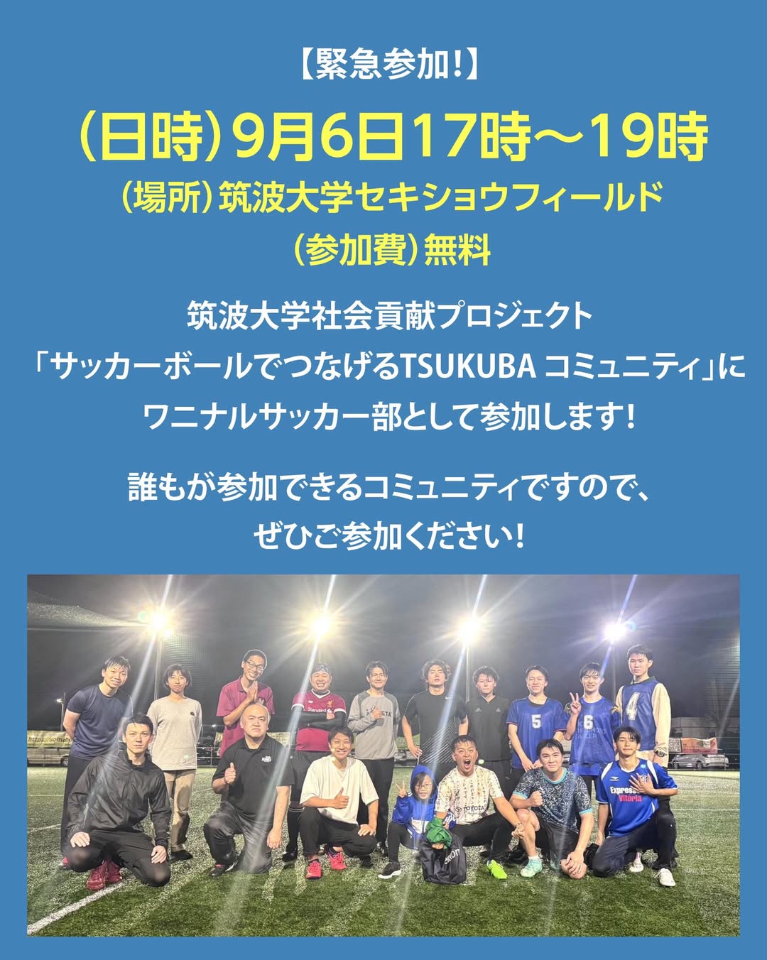 緊急参加! 2025.09.01 ワニナルプロジェクト (日時) 9月6日 17時〜19時 (場所) 筑波大学セキショウフィールド (参加費) 無料 筑波大学社会貢献プロジェクト 「サッカーボールでつなげるTSUKUBAコミュニティ」にワニナルサッカー部として参加します! 誰もが参加できるコミュニティですので、 ぜひご参加ください! 前の記事へ 一覧へ戻る 次の記事へ