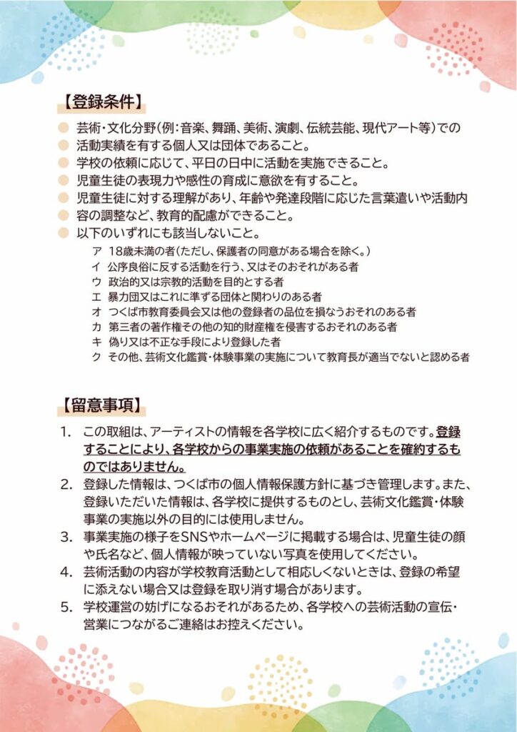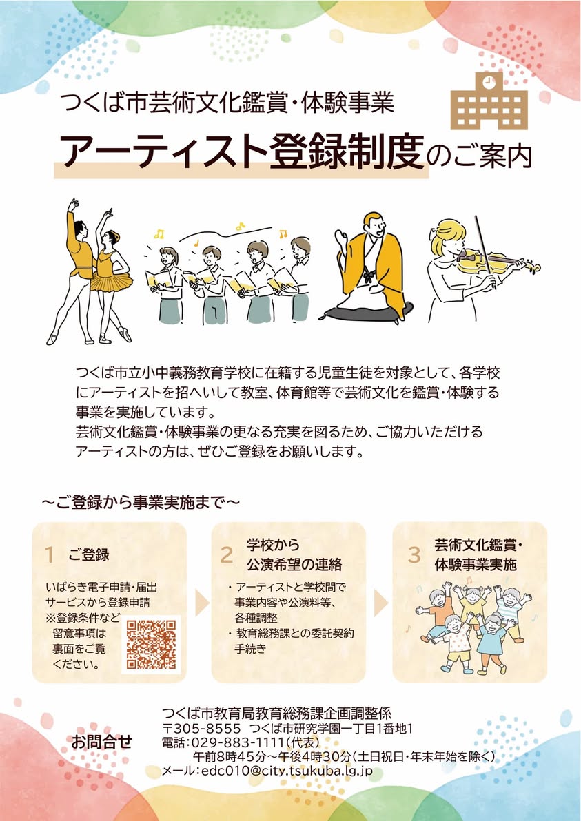 今回のアーティスト登録制度の導入により、市内で活動するアーティストや団体の皆様が本事業に参加しやすくなり、学校側にとっても多様な芸術文化と出会う機会が大きく広がりました。つくば市には、伝統芸能から現代アート、音楽、パフォーマンスまで、多彩で魅力あふれる表現者が数多く存在します。こうした皆様の活躍の場がさらに広がることを大変嬉しく思います。