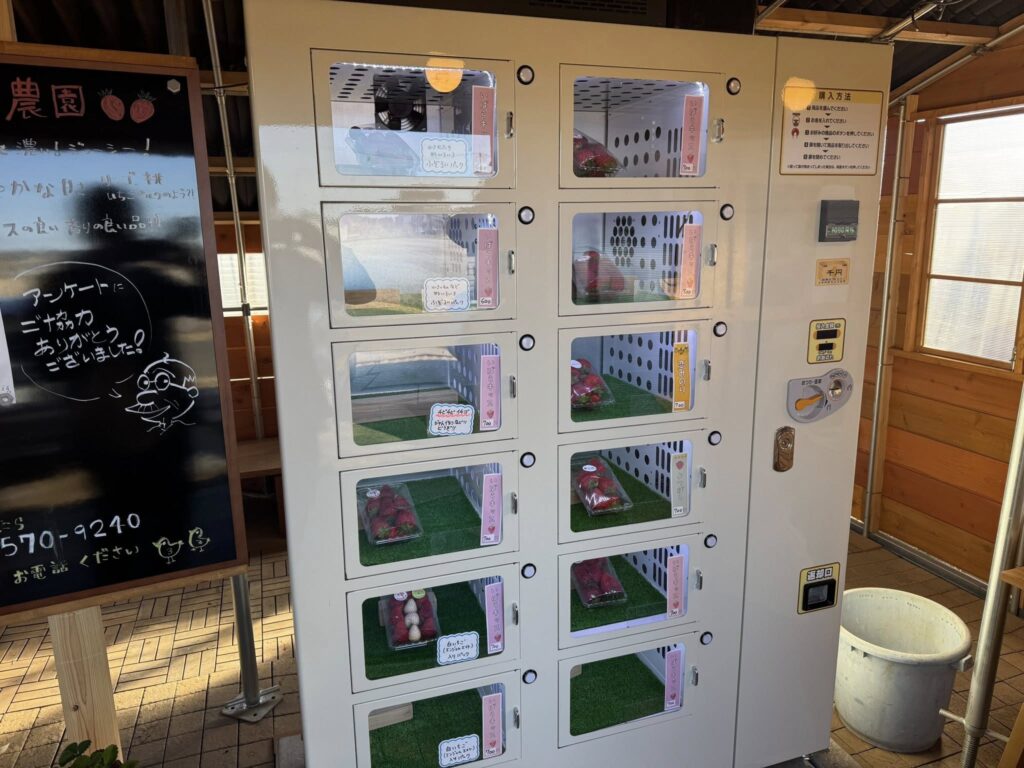 一つひとつ丹精込めて育てられた高品質ないちごが、園内の自動販売機で手軽に購入できるのも嬉しいポイントです。