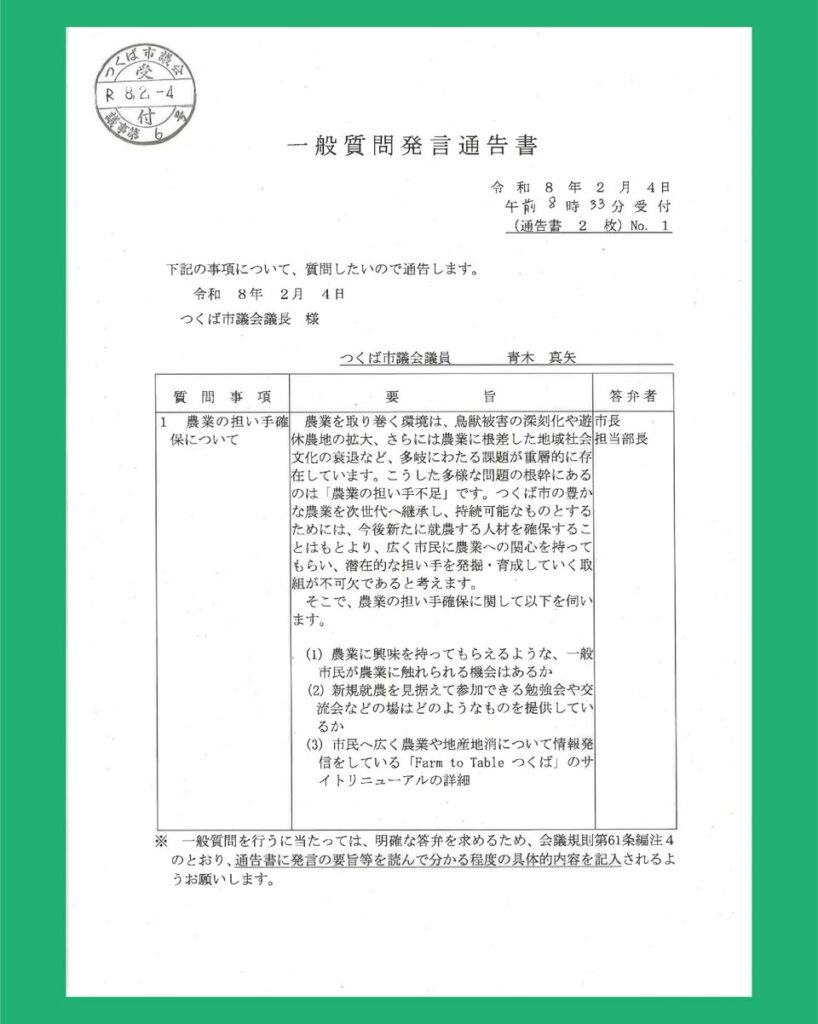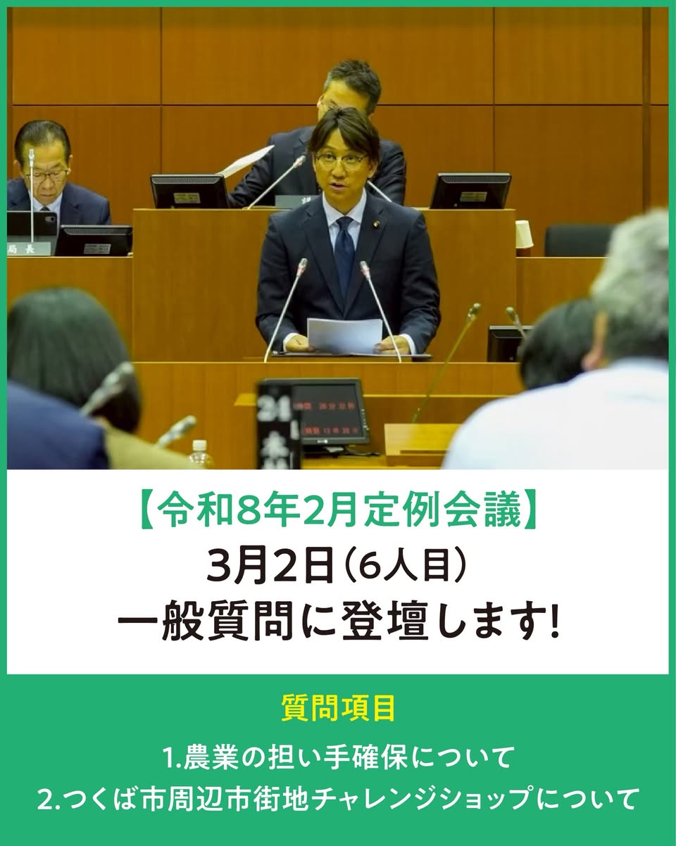 令和8年2月定例会議にて、一般質問を行います。 私は当日【6人目】に登壇する予定です。