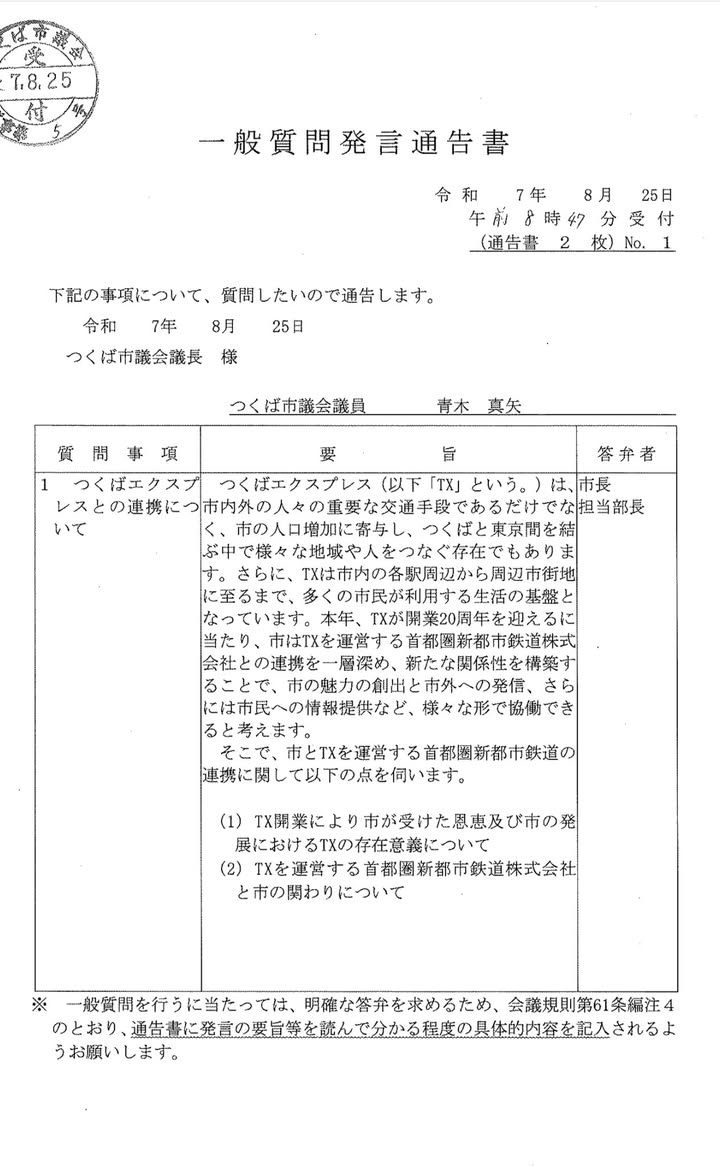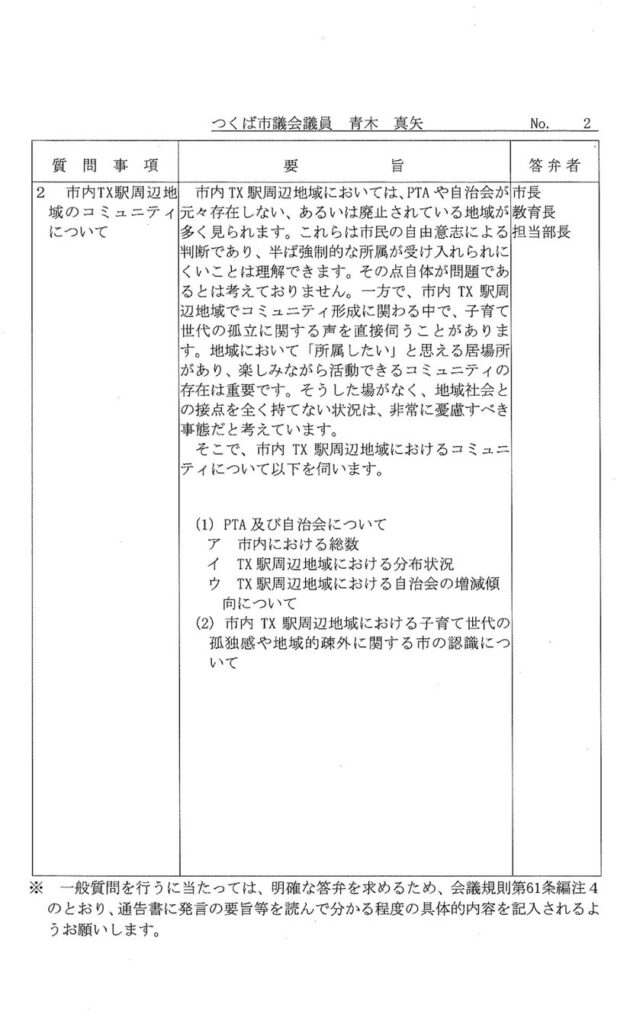 今回の私の一般質問の通告内容は、【つくばエクスプレスとの連携について】および【市内TX駅周辺地域のコミュニティについて】です。