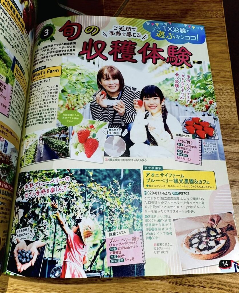 『るるぶ つくばエクスプレス』にてアオニサイファームが紹介されました 2025.05.11 雑誌・広報誌掲載 開業20周年を迎えた「つくばエクスプレス」沿線を特集した雑誌『るるぶ つくばエクスプレス』にてアオニサイファームが紹介されました! 掲載されたのは「旬の収穫体験」特集ページ。つくばの旬を味わえるスポットとして、当園のブルーベリー狩り体験をご紹介いただいています。 ブルーベリー狩りは、6月の第2週頃から8月末まで開催予定です。現在、開園に向けて準備を進めており、ご予約もまもなく受付を開始いたします。 つくばの自然の恵み・ブルーベリーの美味しさを、ぜひ体験しに上郷のアオニサイファームへお越しください! 前の記事へ 一覧へ戻る 次の記事へ